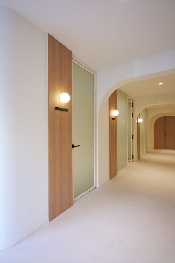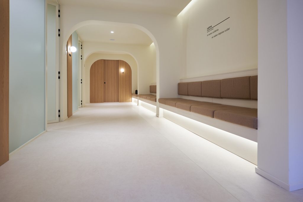 La luz suave, los materiales naturales, los tonos neutros y la fluidez de los recorridos construyen una sensación de calma que acompaña al paciente desde la entrada.